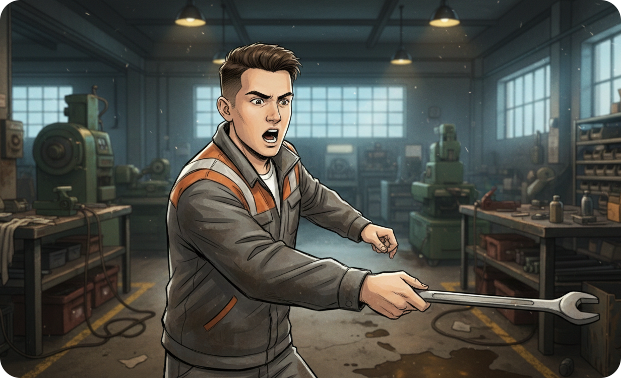 Statt die Dichtungen aufzuheben, feuerte Kevin den 13er-Schlüssel auf die Werkbank. Es klirrte laut. „Boah, chill mal! Immer nur Meckern!“, blaffte Kevin zurück, die Stimme schwankend zwischen Bariton und Kiekser. „Das Regal steht da auch total bescheuert. In diesem Laden ist doch eh alles veraltet. Mein Onkel sagt, in modernen Firmen gibt’s Roboter für sowas.“